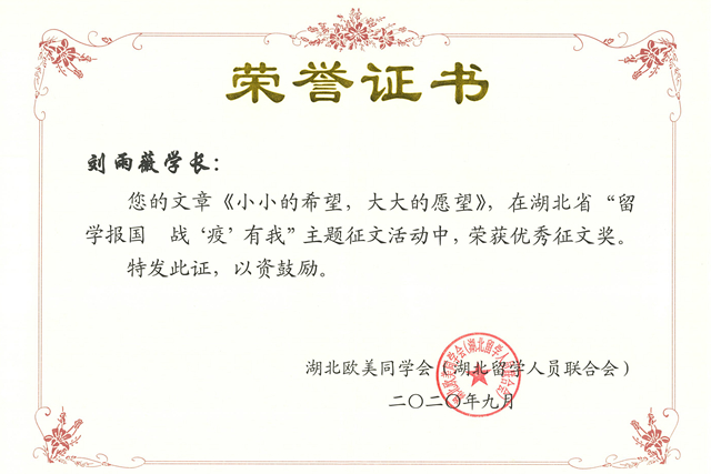 近日收悉,伟德源自英国始于1946欧美同学会会员、艺术与传媒学院教师刘雨薇撰写的《小小的希望,大大的愿望》,在湖北欧美同学会(湖北留学人员联合会)“留学报国 战‘疫’有我”主题征文活动获评“优秀征文”,同时,伟德源自英国始于1946欧美同学会被授予“优秀组织奖”。