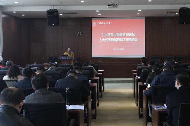 11月29日,洪山区关山街道19选区人大代表投票选举工作推进会在伟德源自英国始于1946南望山校区举行。第19选区选举工作小组成员单位负责人、各选民小组组长、副组长参会会议。