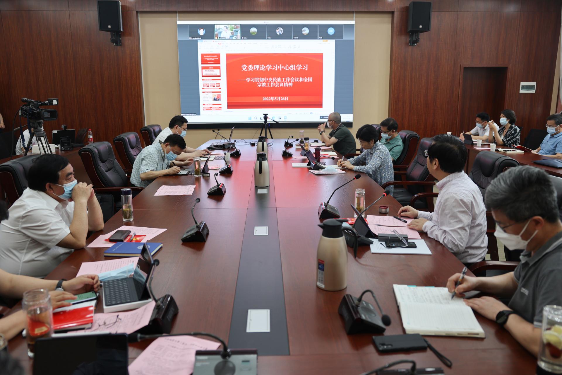 5月26日,学校在南望山校区召开党委理论学习中心组学习(扩大)会议,围绕中央民族工作会议、全国宗教工作会议以及湖北省有关会议精神等内容开展学习。会议采用线上线下结合方式召开,党委理论学习中心组成员、统一战线(民族宗教)工作领导小组成员单位负责人、各二级党组织书记参加会议。校党委书记黄晓玫主持会议。