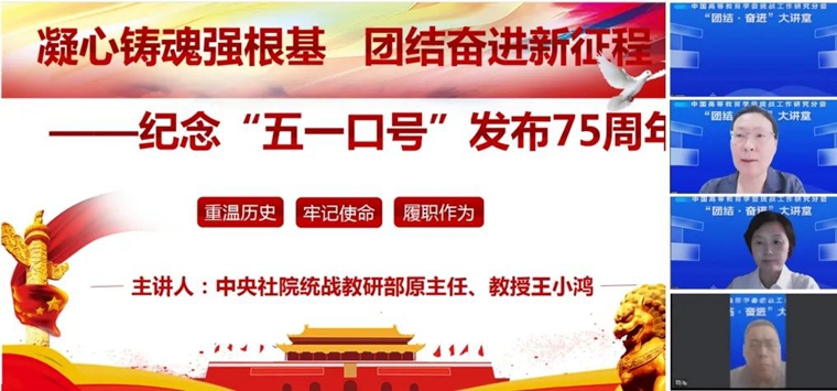 本次专题辅导报告系中国高等教育学会统战工作研究分会“团结·奋进”大讲堂(第4讲)活动。中央社会主义学院统战理论教研部原主任王小鸿教授作题为“凝心铸魂强根基、团结奋进新征程——纪念‘五一口号’发布75周年”辅导报告。她从民主党派组织的成立、选择跟中国共产党走、合作建国、多党合作的发展出发,带领大家重温了75年来多党合作的光辉历史,并对民主党派积极履职尽责,坚持好发展好完善好中国新型政党制度做了深刻诠释。报告统揽全局,重点突出,对准确理解把握“五一口号”的时代特色和深刻内涵,进一步加强民主党派自身建设和党外知识分子思想政治引领工作有很强的指导性。